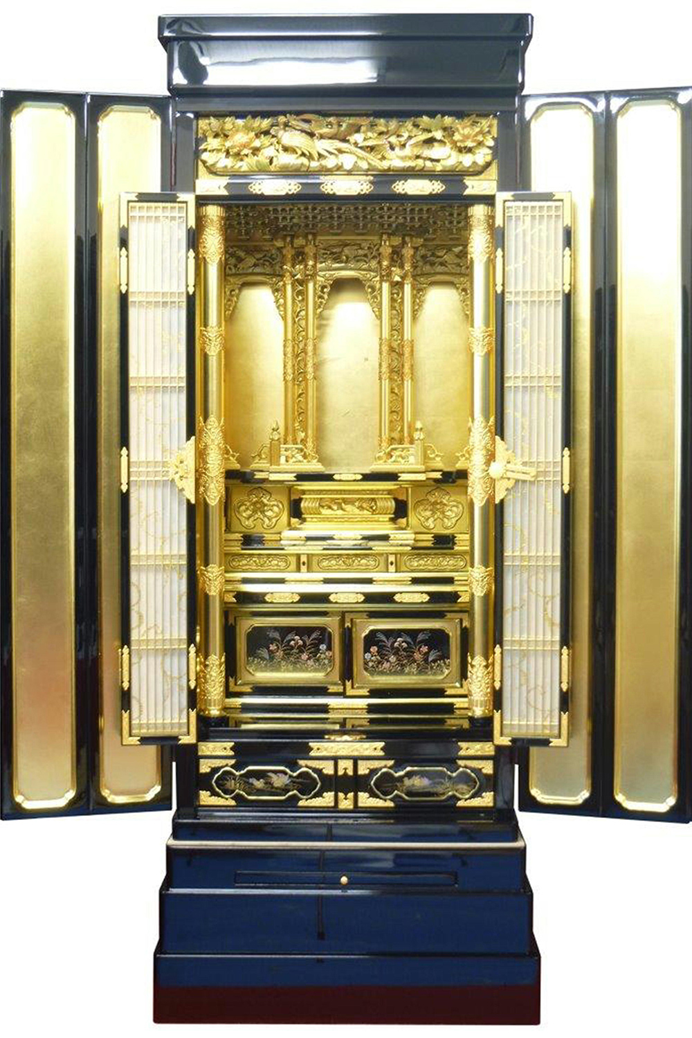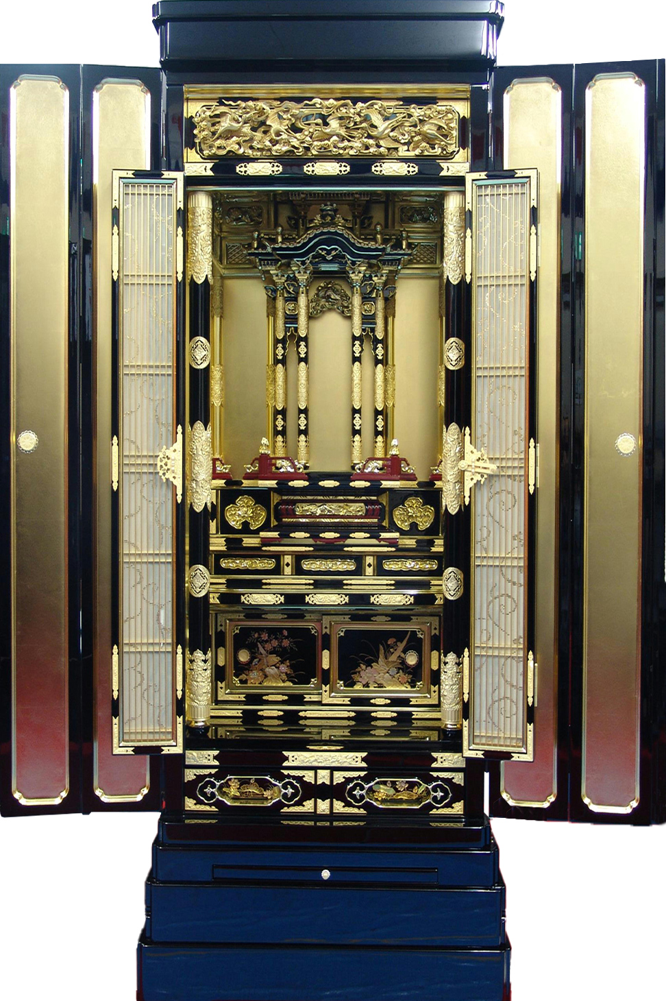 白木に漆を塗り、金箔や金粉を施すことからこの名が付きます。また「塗仏壇」ともいいます。いずれも唐木仏壇に対する名称です。蒔絵・彫刻・錺金具などの日本古来の伝統工芸の技法が集約されており、技巧による豪華さが特徴。伝統的な金仏壇の内部は、各宗派の本山寺院の本堂を模しています。
