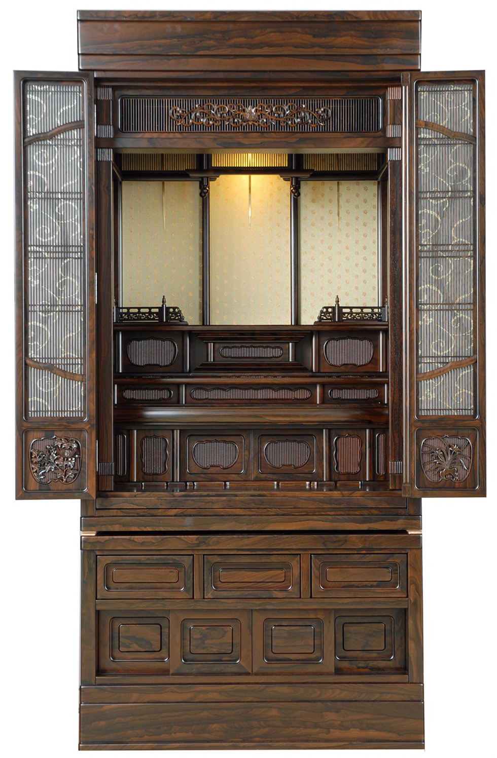 唐木仏壇とは、黒檀や紫檀と言われる銘木を用いて、木目の美しさを生かした仏壇を、唐木仏壇といいます。金仏壇に比較して簡素なもので、木材の種類や材質により、価格が違ってくるのが特徴です。