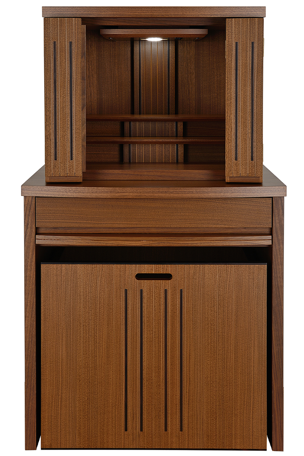 ウォールナットの六角厨子型本体に「江戸小紋」が刻まれた和の表情が魅力のお仏壇です。下台がスライドして供物棚また経机として有効に利用出来ます。